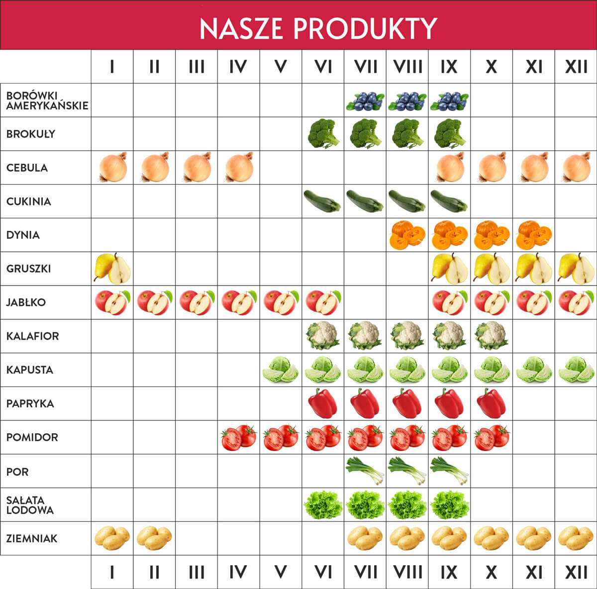 Do naszych głównych produktów eksportowych należą m.in. papryki, jabłka, ziemniaki, pomidory, sałaty i kalafiory, a w sezonie letnim popularnością cieszą się także truskawki i borówki amerykańskie.