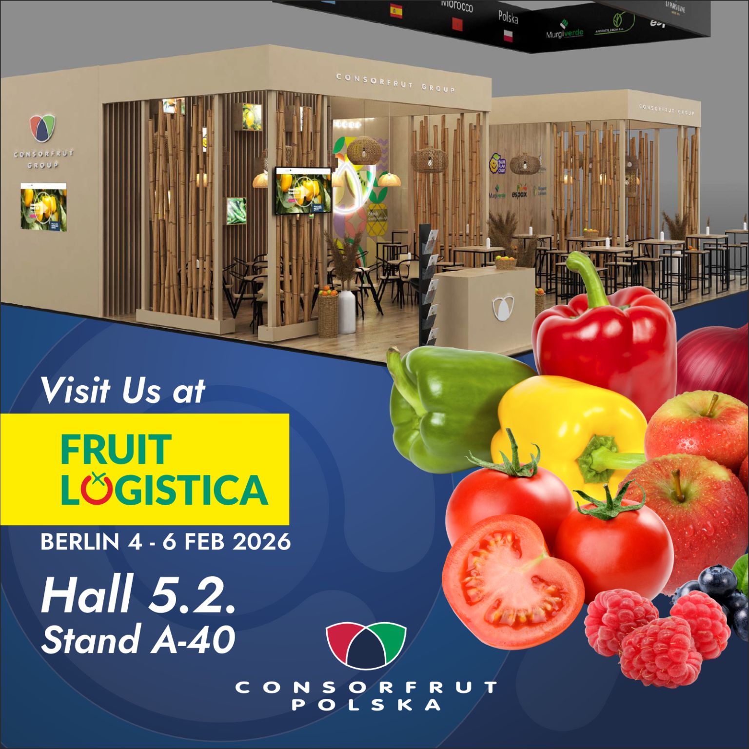Meet us in Berlin at Fruit Logistica 🍏🌶️🍇🥑 4-6 February 2026 🎯 📍 Visit Hall 5.2, Stand A40 to explore our freshest ideas, products and partnerships 🤝🌍 #FruitLogistica #Berlin2026 #FreshIdeas #MeetUs